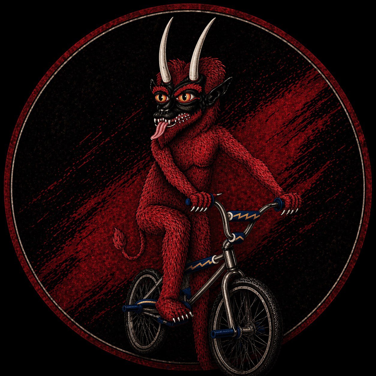 Red fur. White horns. BMX.